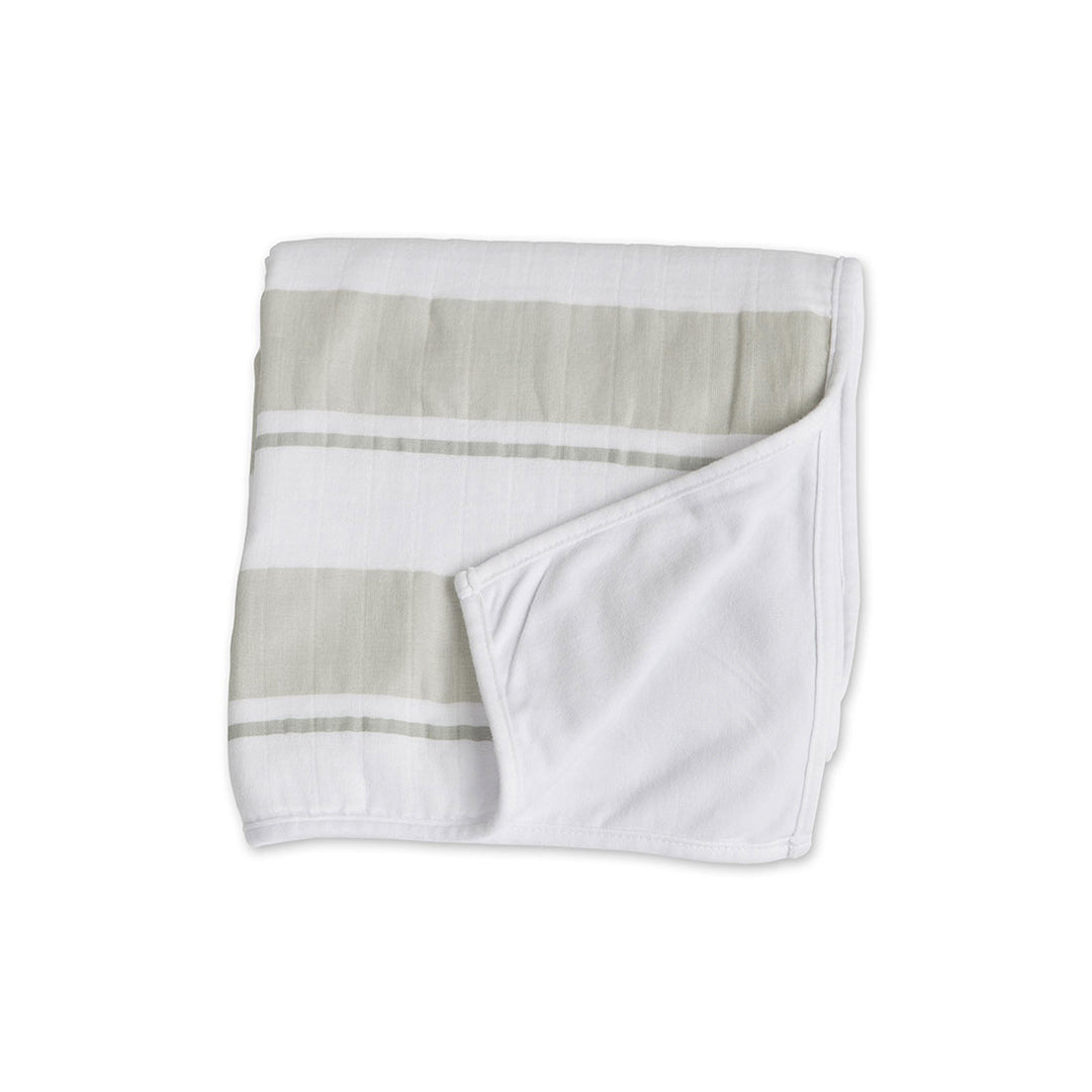 The Childhood Blanket has two layers of cozy fabric; dual layer muslin in bold stripes and soft white jersey. Provides comfort for newborns and is large enough to last well into childhood. Provides warmth and comfort at playtime, snuggle time and bed time.
