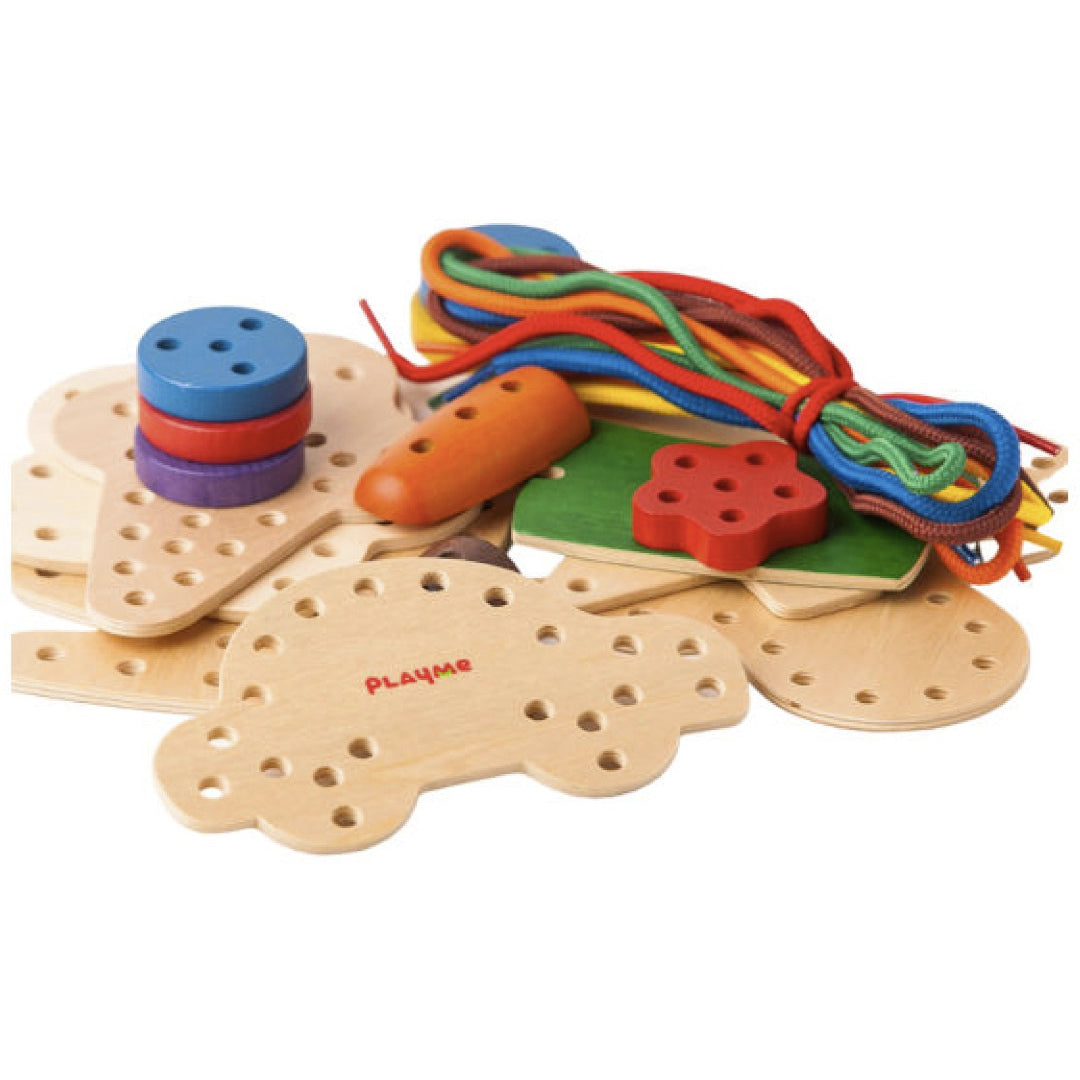 One-of-a-kind children's activity that simulates sewing. Use the different wooden pieces and combine them using the colorful laces to create shapes. Develop your child's hand eye coordination and depth perception. Play with your child and watch them follow how you attach pieces together.