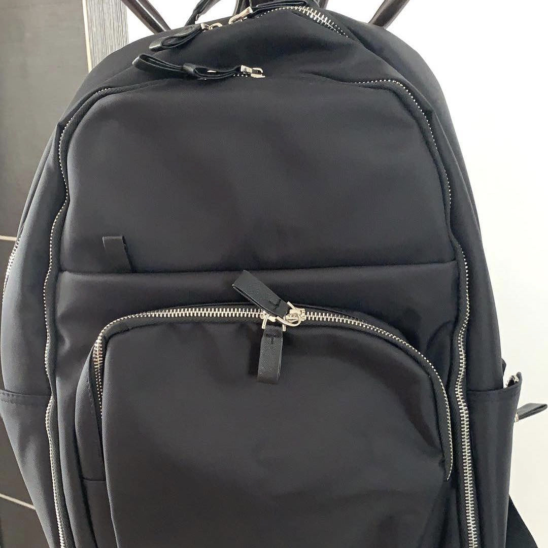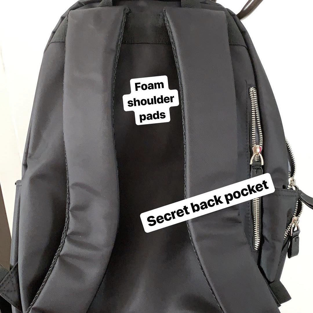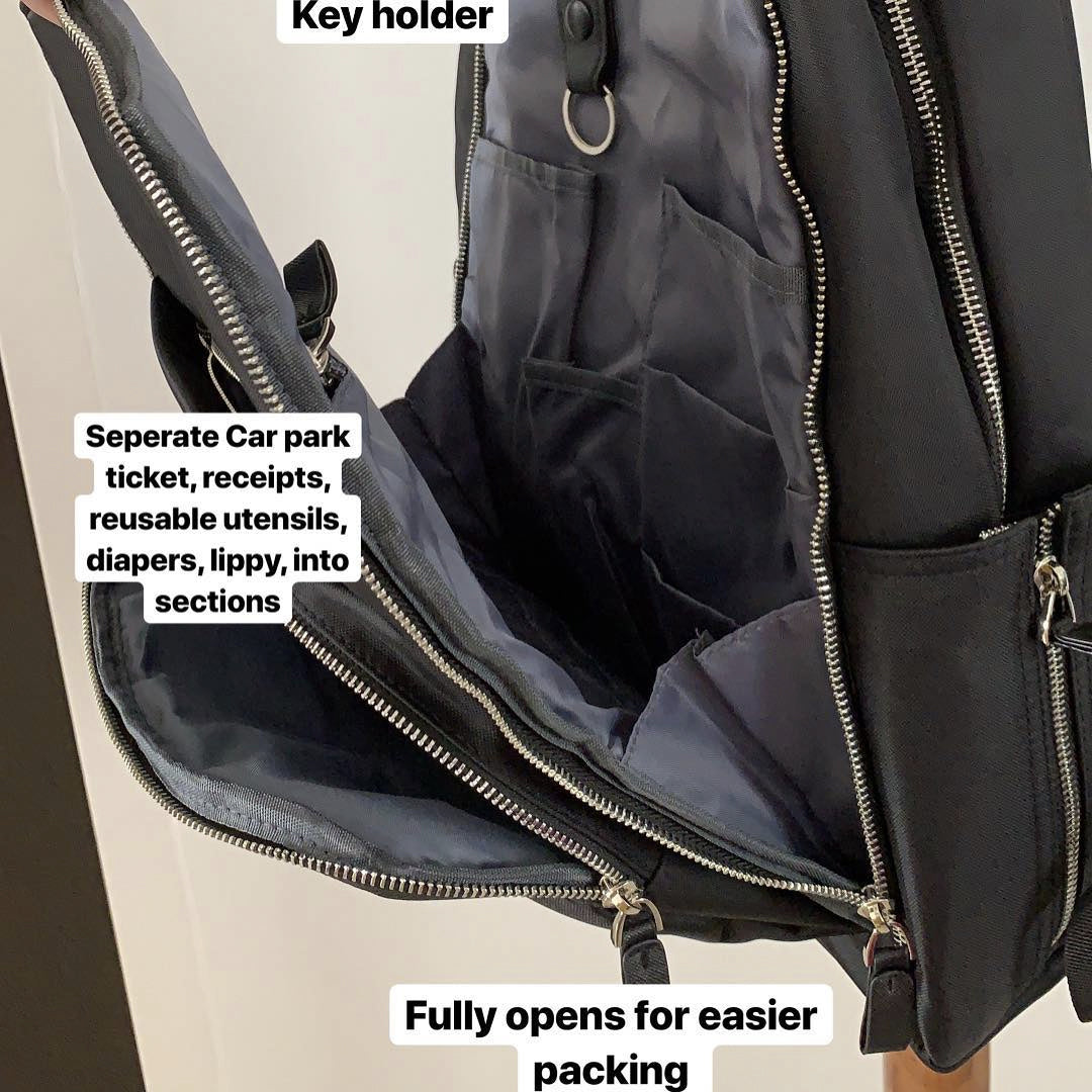 Compact, tall, washable and water repellant. The Charliebaby backpack-style work bag has a secret back pocket, umbrella pocket, pen holders and key holder. The frontmost compartment has 3 separate bottle pockets.