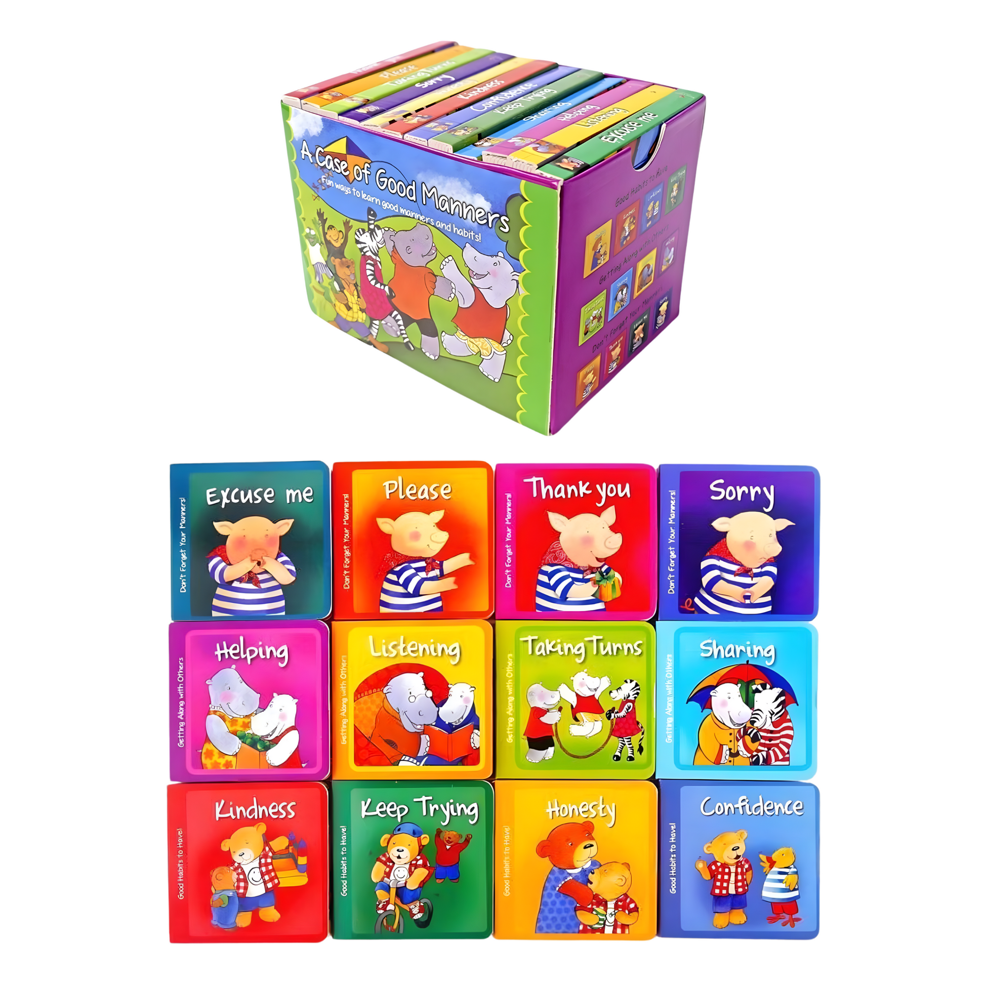 12 mini board books in a glossy carry case with handle. Perfect for young readers and parents – teaching good manners in a fun way!