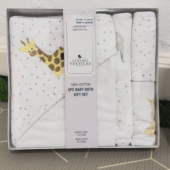 Add a touch of luxury to baby's bath time with this gorgeous 100% cotton 5-piece baby bath set featuring a hooded towel and four washcloths. Soft and gentle against baby’s delicate skin, this gift set is a practical yet beautiful gift for new parents.