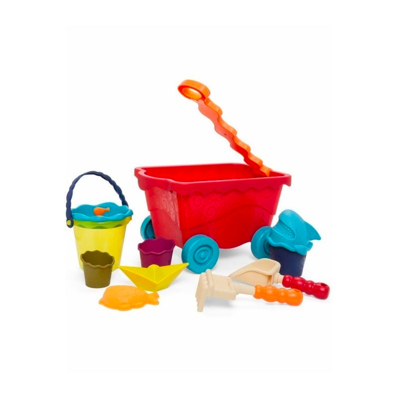 - Beach Set: Head off on sandy adventures with a bright red wagon and 10 colorful sand toys!