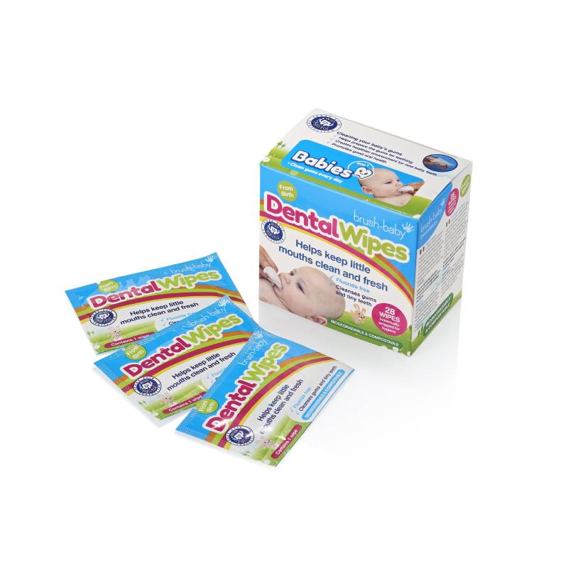 - EASY TO USE EVERY DAY. brush-baby Dental Wipes are soft, strong and uniquely textured gum and tooth wipes, designed to cleanse delicate mouths. Each one is sterile and easily wraps around your finger to gently wipe away food residue or milk deposits from your baby's gums and tongue. Keep some baby gum wipes in your change bag too for a freshen up on the go!