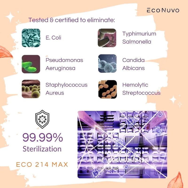 EcoNuvo (ECO 214 MAX) uses its 16 UV-C LEDs to eliminate 99.99% of germs, viruses, and bacteria like E. Coli & Salmonella, as well as dust and unwanted odors. It offers three main functions to choose from including energy saving mode that completely powers off the unit after its cycle is complete.
