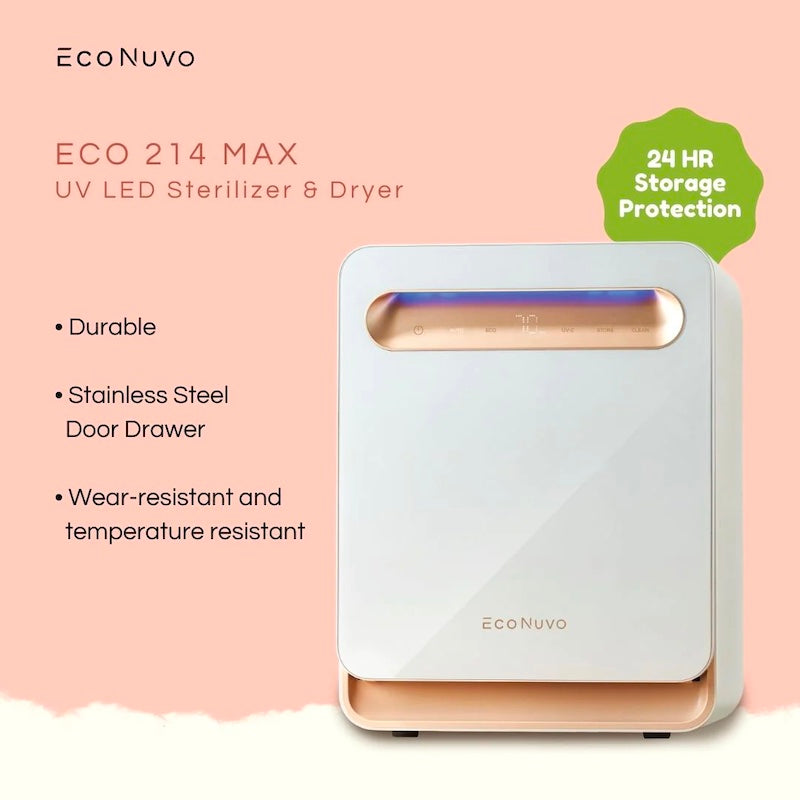 MAX 25 L Capacity - The new and improved EcoNuvo ECO 214 MAX has an impressive 25L that can sterilize more baby bottles, teethers, utensils, bowls, cups, stuffed toys, or other household items in one go. ECO 214 MAX now not only has two adjustable stainless steel racks, but also has an adjustable stainless steel basket to offer more space.