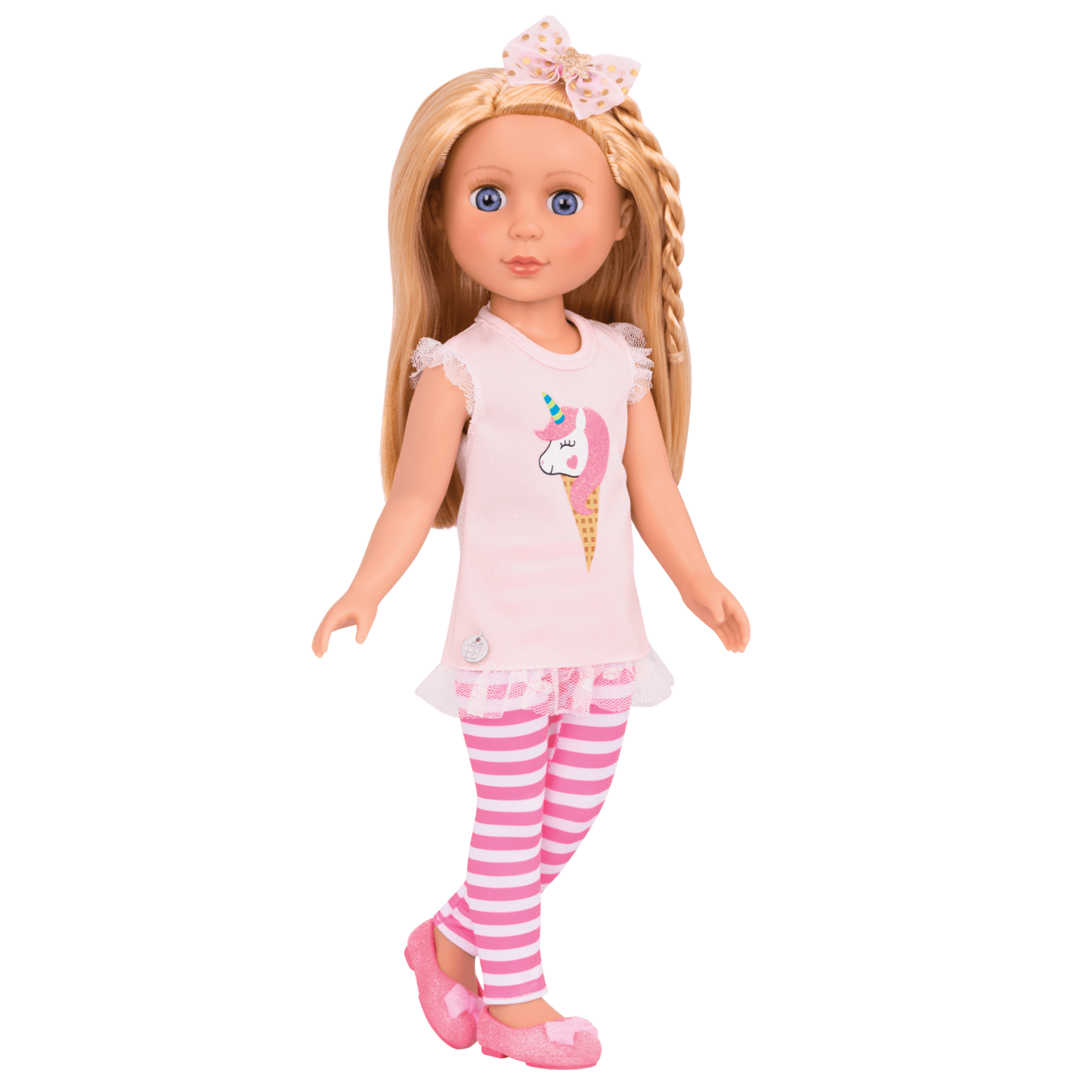 - 14-inch Doll: Lacy has long blond hair with a twist, bright purple eyes, long eyelashes, and she loves sparkles, stars, and unicorns!