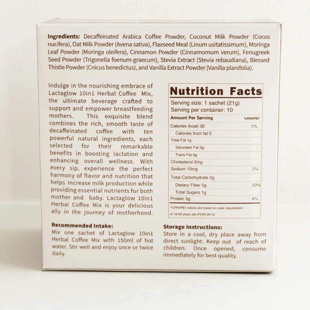 LactaGlow 10-in-1 Herbal Coffee Mix is a unique blend of herbal ingredients and coffee designed to support lactation and overall wellness for breastfeeding mothers.
