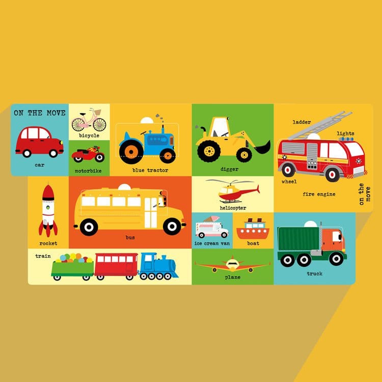 BABY’S FIRST 100 WORDS has five themed double-page spreads, each one with flaps to lift and a tab for easy page-turning. The themes are around the home, getting dressed, vehicles, animals and mealtime. The images are bright, colourful and inclusive, and the flaps are integrated (not stuck on), designed to be strong enough to withstand enthusiastic handling.
