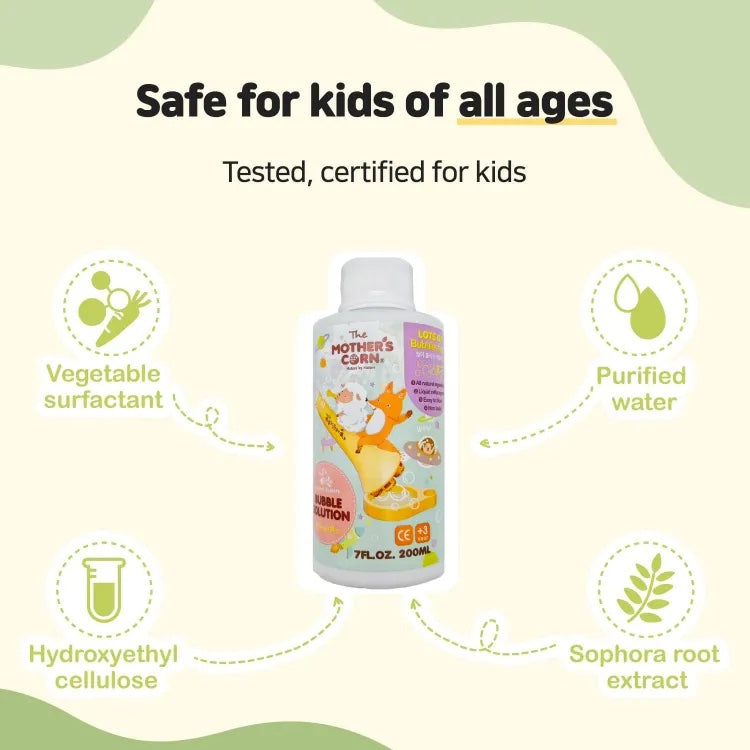 Mother’s Corn Bubbles are unique as it can be used both indoors and outdoors because the solution makes a lot of bubbles but don’t leave any residue. This Bubble solution uses natural ingredients (natural cellulose extracted from plants) and is thoroughly tested assuring your child’s safety.
