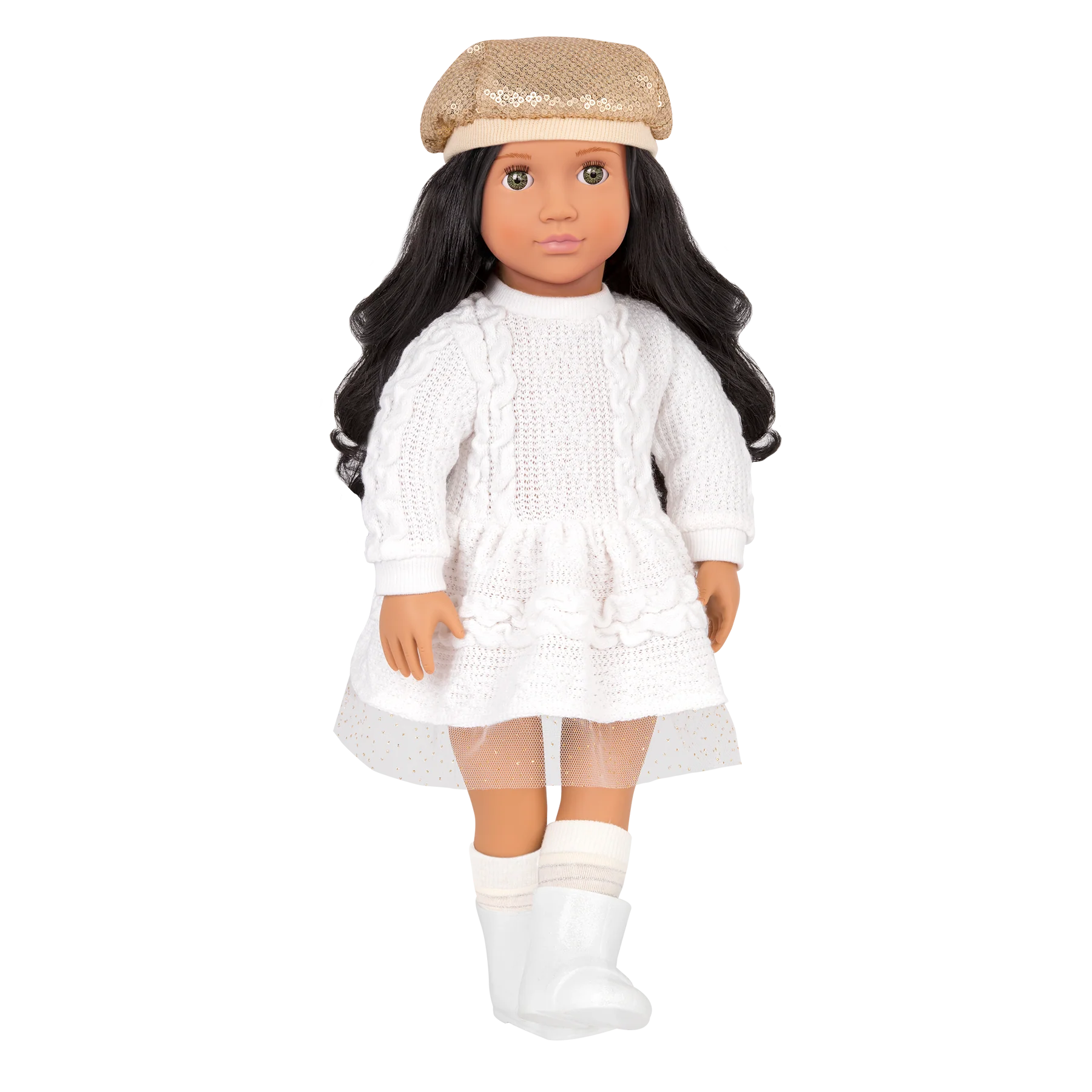 Shine bright with the Our Generation 18-inch doll Talita! She has pale green eyes that open and close, and her long, wavy black hair is lots of fun to brush and style! Talita is wearing a soft, white-knit dress with a sparkly tulle hem, cozy boots, and her gold sequin hat adds a touch of glamour during her outdoor activities. Best of all, her outfit features easy-open closures that make it fun to mix and match with other Our Generation clothing sets, so there's a world of dress up and make believe to play with!