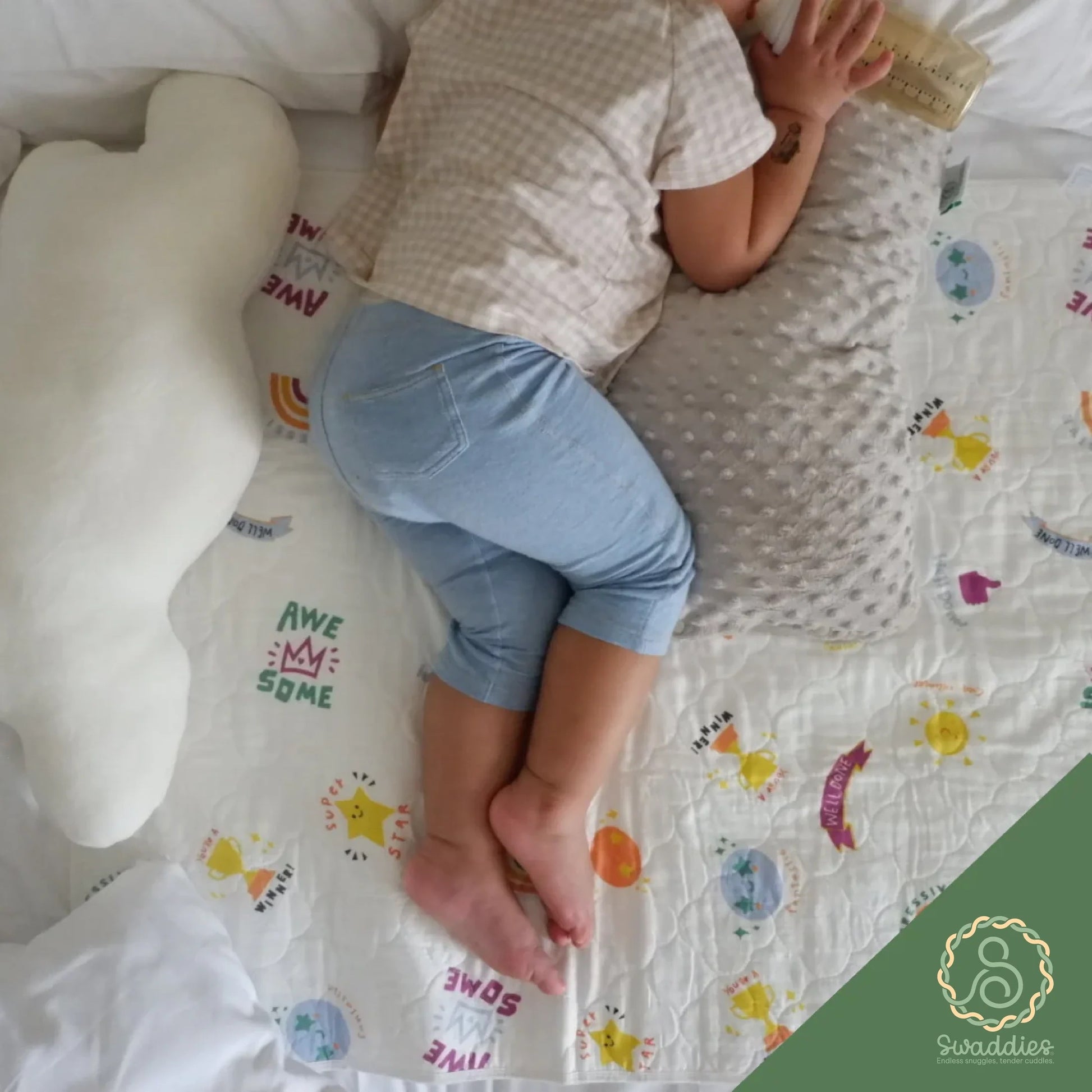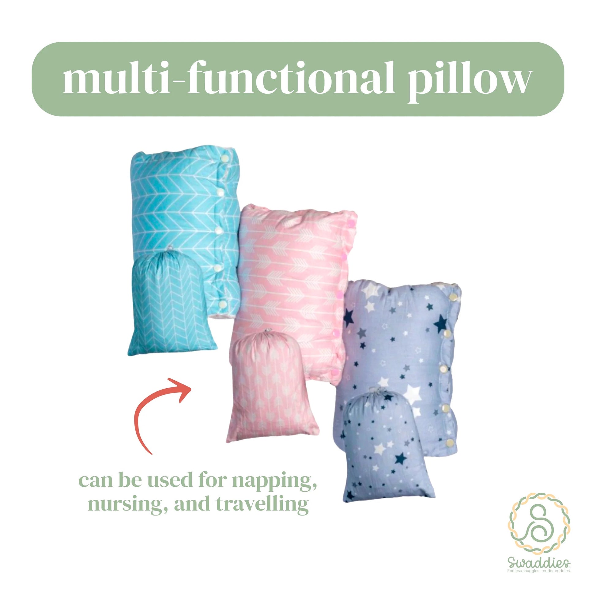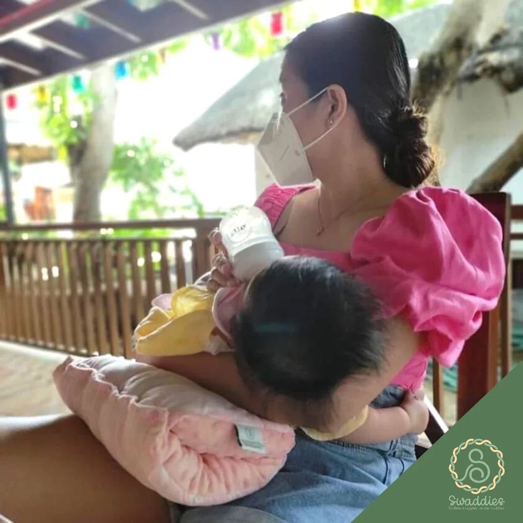 Swaddies PH Multifunctional pillow is made from cotton fiberfill, polyester cotton (front side) and microfiber soft dotted fabric (back side) for maximum comfort and support especially for nursing moms.