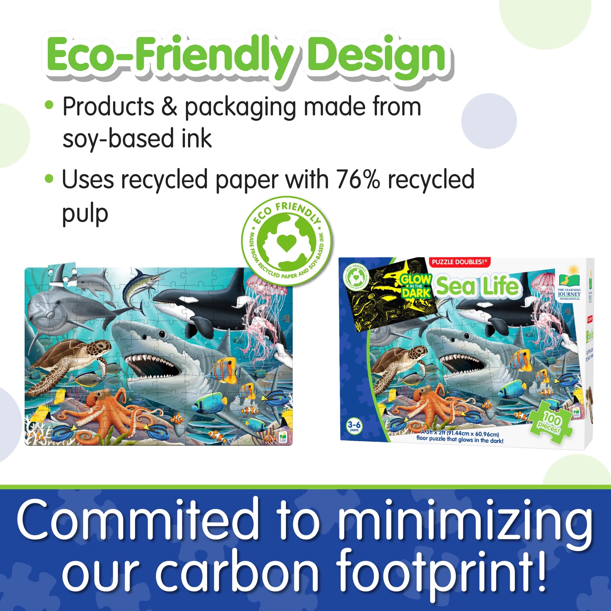 Learning about Sea Life has never been so much fun! After assembling the 100-piece puzzle, turn off the lights and watch it glow in the dark! Puzzle Doubles! Glow in the Dark! puzzles are a fun way to expand your knowledge of different environments.